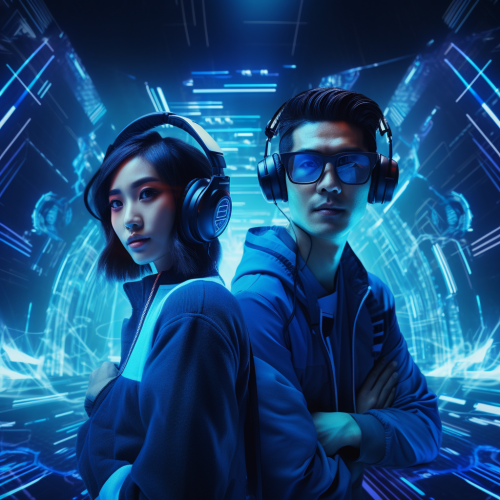 a couple walking on a street listening to music with headphones and really enjoying the music, neon glowing lights, hyper realistic, vibrant colors, 8k --ar 16:9