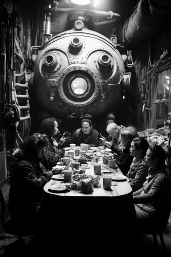 banda de rock de 11 integrantes, estan sentadas en circulo conversando y riendo alrededor de una mesa, estan dentro de un foro de television, black background surrounded, camera cenital position view, dark light, podcast style, documentary, hyper realistic, cinematic feel --q 2 --v 6.1 --s 750