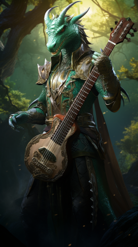dragonborn dungeons and dragons warlock bard, A dragonborn, with emerald green scales, in the middle of a ritualistic dance, with a harp nearby and arcane runes glowing beneath their feet, set within a dense forest clearing with ancient stone structures and altars, the aura feels surreal and ethereal, with nature watching in rapt attention to the dragonborn's performance, photography, shot with a telephoto lens at 85mm to capture a close-up with a soft background blur, --ar 9:16 --v 5.2