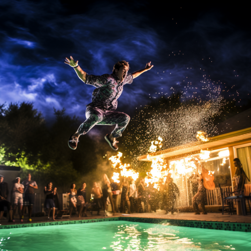 Project X movie, drunk college kid jumpoing in the pool, pool surrpounded by college kids, music playing, photo realistic, ar 1:1 --fast