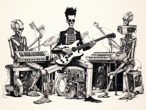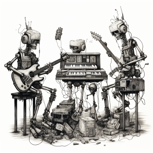 a guitar-playing robot that looks like Elvis presley, on a stage with a band of robot musicians, in 1980s style, rendered as an amateurish black & white pen & ink sketch --ar 4:3