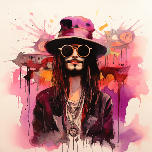 a funny, cute, happy, teenage folk singer, long hair, fedora hat wearing goggles and a big brown vagabond fedora hat with a feather, selling his soul to the devil at the crossroads, pink, purple, rockstar skinny jeans, van gogh paintings, huncho jack jack huncho album artwork, tim burton, travis scott astroworld, ralph steadman, ultra detailed, oil painting, 8k