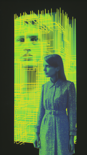 The green man meets the tall girl, April Greiman, Susan Kare, Emigre, Pacific Wave, early rave flyer graphics, The Mind's Eye, harsh pixelated thermographic imagery with warped fonts, first wave image manipulation software, --ar 9:16