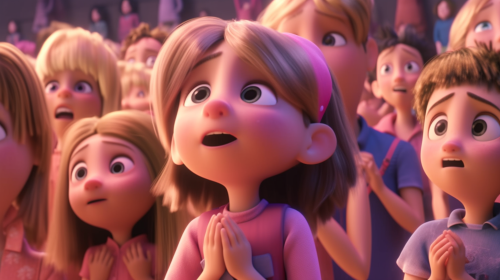 close up view of people wearing pink, waving pink flags, crying tears of joy, happy, hugging together, concert, pixar style --ar 16:9 --s 750 --v 5.0