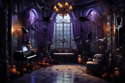 a large room, romantic music space, exquisite luxurious decoration, microphone stand, halloween, impressive colors, --ar 6:4