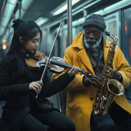 Realistic Photograph depicting a Beautiful Asian girl playing the violin wearing a black orchestral unniform with an old black man playing a saxophone wearing a yellow coat on the subway as a duet