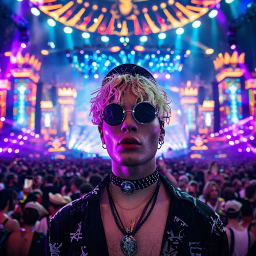 photo of a vibrant and energetic EDM festival scene at night with a massive crowd. In the foreground, a stylish Hasidic Jewish Man with blonde hair wearing round sunglasses, a choker, and a kippah is looking towards the camera. The background features a large, colorful, illuminated stage.