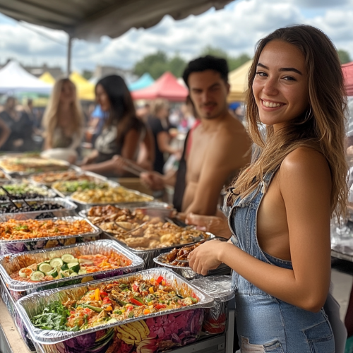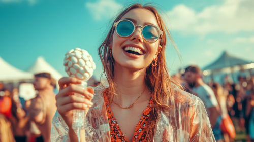 a 25 year old female influencer, she is holding a clear plastic maraca by its handle, the maraca is only half full of small oval white TikTac mints, she is at a sunny, busy outdoor UK music festival, shot by steve ketner --ar 16:9