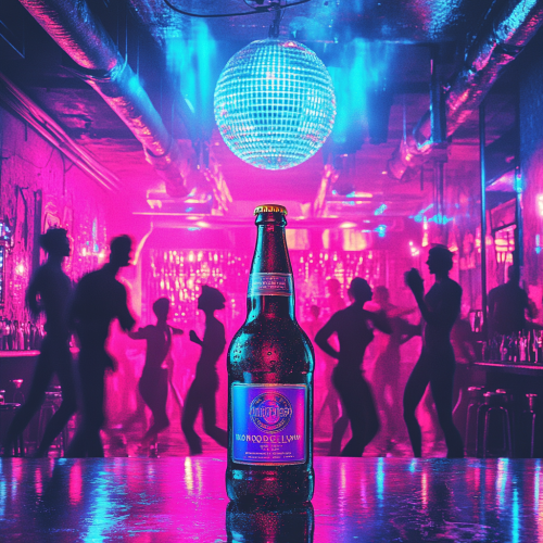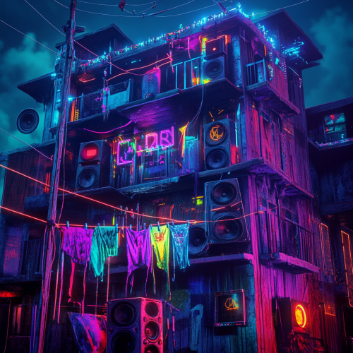 speakers melting on a clothesline in Dali-esque fashion. A multi-story neon party house in the background. The neon party house is lined with a bunch of neon lights and speakers. dark coloration with neon highlights all over the house and speakers