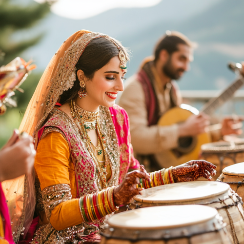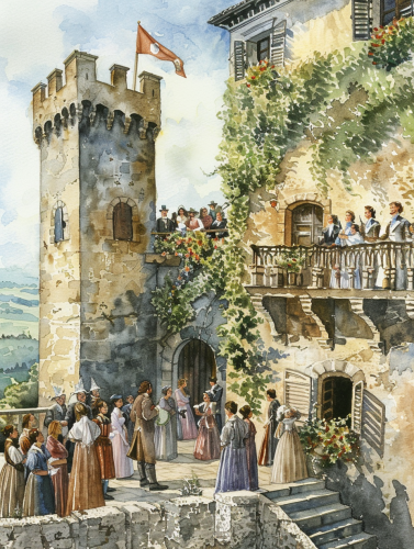 A lofty terrace on the walls of the castle. At the door of the flag. On one terrace pop and several wedding guests; on another newlywed with several relatives. Down in the yard, wedding guests, musicians and singers. details, watercolors, --v 6.0 --ar 3:4