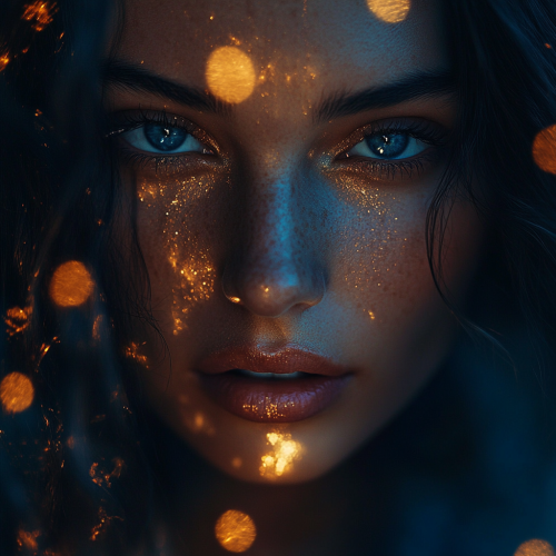A close-up of a singer’s face, lit with a mix of cool blues and warm golds. A faint glow encircles her, reflecting the mix of shadow and light in her eyes. The background is minimalist, featuring a dark, abstract texture that suggests depth without distraction. Soft, golden lights surround her, symbolizing the hope amidst darkness. There's a hint of an echo, with faint reflections or mirages trailing her movements, capturing the ethereal sound of the cover version.