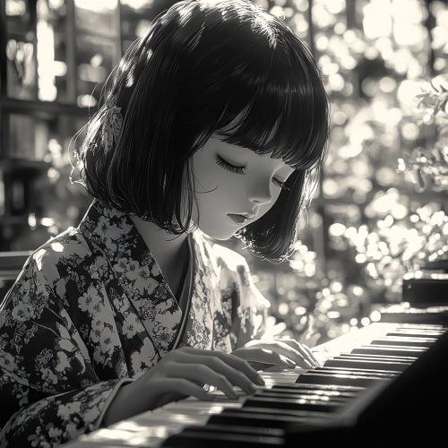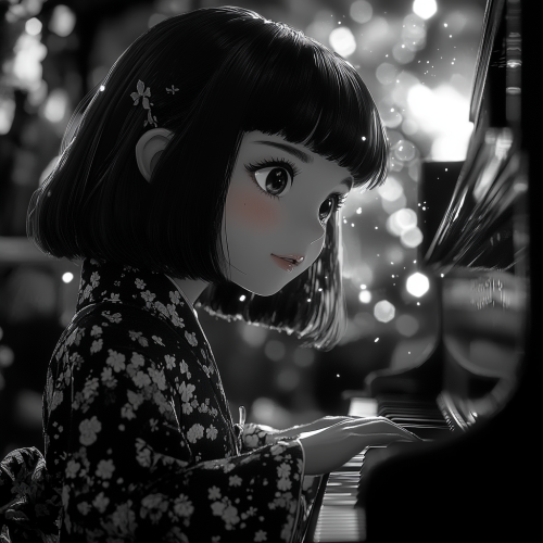 4k chibi full body,kawaii,HD photto.black and white ,a woman with a bob cut in a kimono playing the piano digital apace expression is cold rose,horror --s 750 --style raw