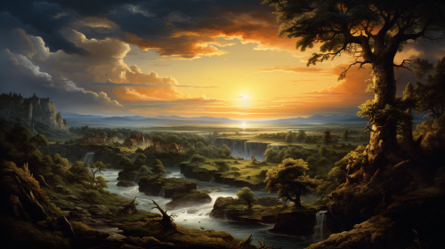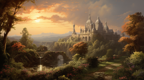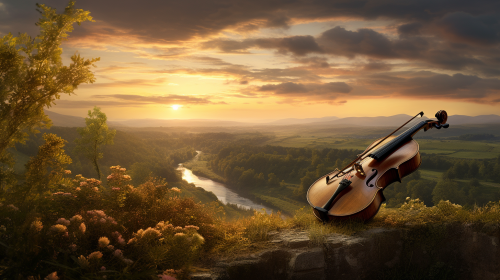 stunning baroque landscape, late 17th century, spectacular landscape, magic hour lighting, beautiful, grand, epic, baroque architecture, violinist --ar 16:9 --v 5.2