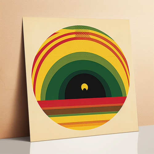 "Minimalist afro-pop album cover, bold African drum icon, reggae color accents (green, yellow, red), simple beige background, memorable and minimalist, no extra details --v 5.0 --s 750