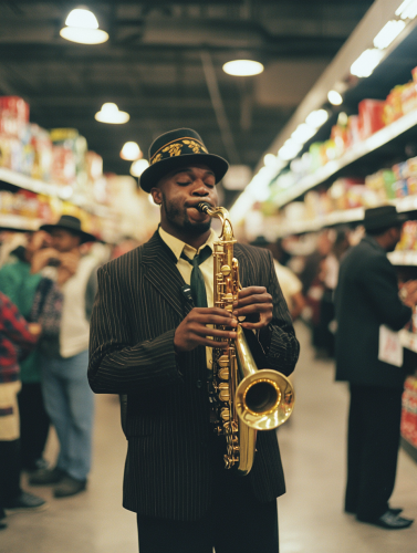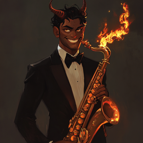 a debonair tiefling man, wearing a tuxedo and carrying a saxophone. The saxophone has flames coming out of the end. The man is smiling rakishly at the camera. Studio Ghibli visual style. --v 6.1