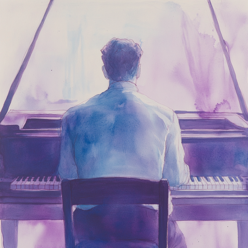 a watercolor paiting of a man sitting at a piano. It should be shot from behind him, only seeing his torso sitting at the instrument, he is facing away from the camera. Should have strong and defined lines, while the rest of the image is soft pastels, purple and light blue