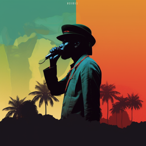Minimalist afro-pop cover, silhouette of a musician holding a microphone, palm leaves in reggae colors, soft pastel background, bold text at the bottom for artist name, minimalist design --v 5.0 --s 750