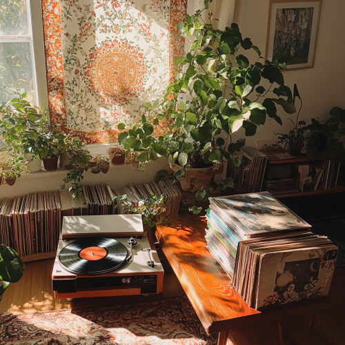 a retro record player in the foreground with a stack of vinyl records on a nice wood table in a beautiful sunlit apartment decorated with houseplants and tapestries