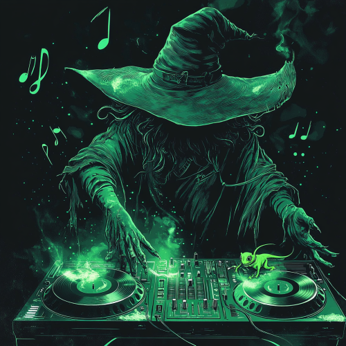 create a drawn poster of a wizard dj playing records on dj tables using magic from his hands. his wizard hat covers his shadowy face. on his shoulder is a small neon green lizard. there are music notes in the air. the vibe is spooky.