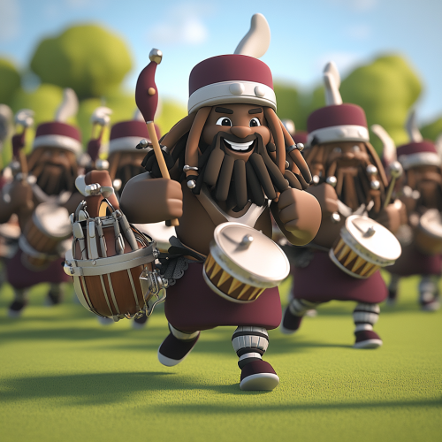 3D cartoon images of a viking marching band . Each viking is african american skintone with dreadlock hairstyle. One viking is playing the quint drums, the viking in the front is playing the snare drum. One viking is playing a trumpet. One viking is playing a french horn. One viking is playing the bass drum. All of the vikings have dark brown skin and are marching. The vikings are wearing maroon knee high socks and gray and maroon high top sneakers with white laces. The viking helmet is a combination of gray, maroon and white. The vikings are doing dance moves while marching. The background is a grassy football field.