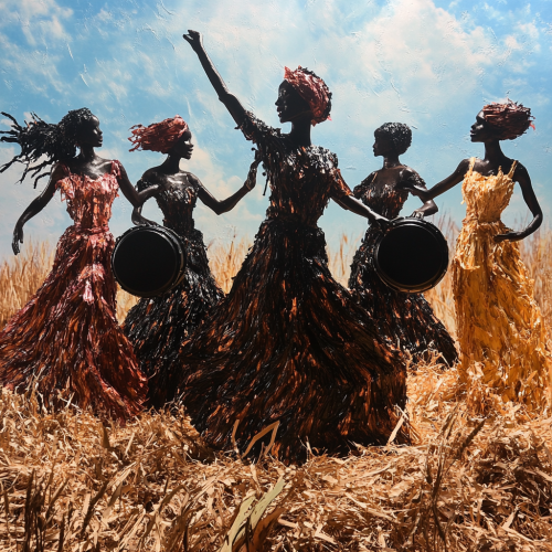 Background : African desert, in the center of the frame a group of five African women in dresses textured with meat fibers, playing drums in the shape of a black Vitamin jar.