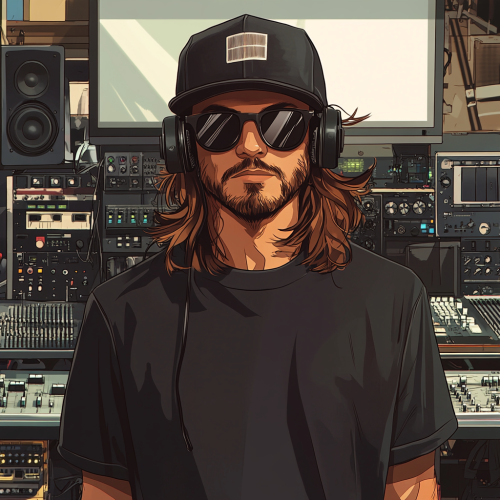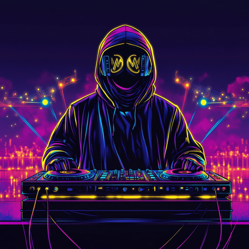 Large DJ booth, festival, DJ with headset and hood, emoji expressions, strong lines, simple neon colors, simplification, one-point perspective, cartoon drawing style