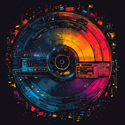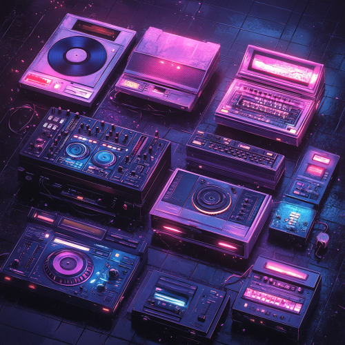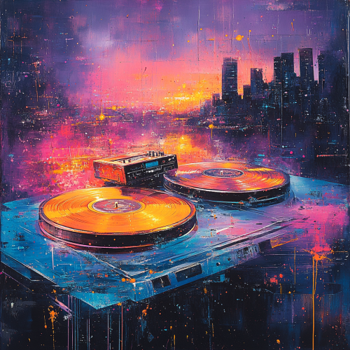 Layered visuals of vintage vinyl records, cassette tapes, and neon sound waves blend with textures like record grooves and faint graffiti. Nostalgic colors like deep purple, gold, and dark orange are contrasted with electric blue and neon pink highlights. with semi-opaque silhouettes of musical instruments and artists representing genres like soul, funk, hip-hop, and R&B. Overall look is textured, inviting, and bridges classic and modern music culture. --s 750