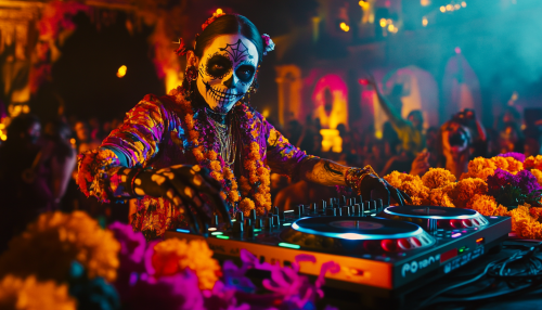 dvd screengrab, from 1982 dark fantasy film, A DJ with vibrant sugar skull face paint, standing behind turntables decorated with marigolds and candles, set in a neon-lit, mystical atmosphere. Bright, colorful lights beam from the DJ booth, illuminating a lively crowd wearing traditional Day of the Dead costumes and accessories. Intricate floral and skull motifs fill the background. High contrast, warm colors with shades of purple, orange, and blue , --ar 7:4