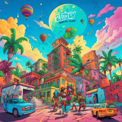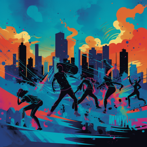 A vibrant and energetic album cover featuring a bright blue sky with fluffy white clouds. In the foreground, a lively silhouette of a city skyline. Include playful elements such as dancing silhouettes and musical notes to capture the mood of dancing in the city. The overall vibe is fun and urban, conveying a sense of rhythm and nightlife. --v 5.0 --ar 1:1 --s 750