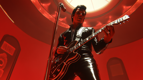 Screengrab of a 1950's super panavision 70 movie, retro style, create Elvis Presley with black leather jacket and trousers, singing with a guitar on a podium, in concert hall, front shot, photorealistic --ar 16:9