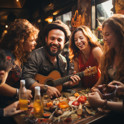 20 friends playing musical instruments at a bar table with girls around having fun and dancing in brazil, crownd, realistic, guitar, percussion, public, singing --s 750 --v 5.2