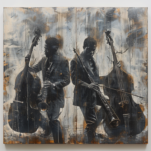 Illustrations or silhouettes of a jazz band with a pianist, double bassist, and drummer, possibly in exaggerated, humorous poses::1 Black-and-white style::1 fun::1 positive::1 --v 6.0 --s 750