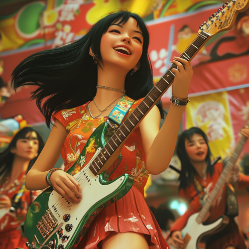 Japanese school festival,she have an electric guitar, colorful decorations, students dancing energetically, vibrant and lively atmosphere, 1970s retro style, detailed background, 4K resolution