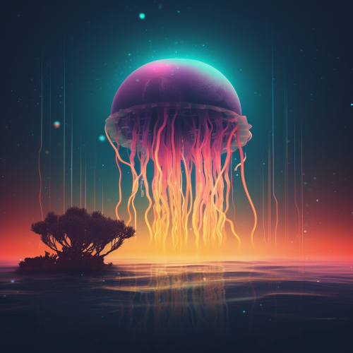 Minimalist album cover featuring glowing jellyfish floating in the night sky over a Jamaican-inspired landscape, infused with reggae and Afro-pop vibes. The jellyfish emit a neon glow in warm tones, illuminating the land below. Surrounding elements include tropical plants and subtle rhythmic patterns to evoke a reggae aesthetic. The scene is vibrant, surreal, and peaceful, using warm colors for a relaxed, dreamlike atmosphere. High detail, mystical and tranquil, no people --ar 1:1 --v 5.0 --s 750
