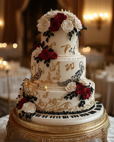 Create a beautiful multi tiered wedding cake style design that features a grand piano and musical notes and piano keys and candle abra. The base cake is fondant that has a marbleized design using bright white and black and grey and gold. Geode design inspiration. Gold Royal icing filigree and paisley and swirls designs. Small red roses and Ivy leaves and small pink and white filler flowers. Buttercream icing borders in white. Rhinestones and gems and pearls. This cake sits on a gold Ornate Cake stand that is placed on a dessert table that has a beautiful satin tablecloth. Spotlights on the cake and curtains in the background. This is a wide shot of a banquet hall. --ar 4:5 --v 6.1 --stylize 500