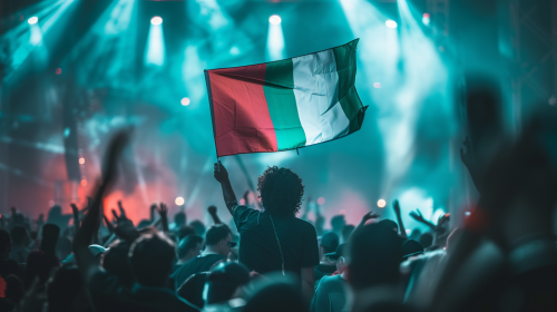 A vibrant festival crowd with people dancing and enjoying the music. In the middle of the crowd, someone is sitting elevated, holding the Italian flag high above their head. The flag is clearly visible, its green, white, and red colors standing out against the crowd. The scene is lively, filled with colorful lights and a warm atmosphere, capturing the energy and excitement of a music festival. The background shows a stage with neon lights, adding to the immersive experience. --ar 16:9 --v 6.0 --style raw