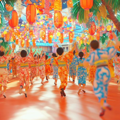 Japanese school festival, colorful decorations, students dancing energetically, vibrant and lively atmosphere, 1970s retro style, detailed background, 4K resolution