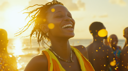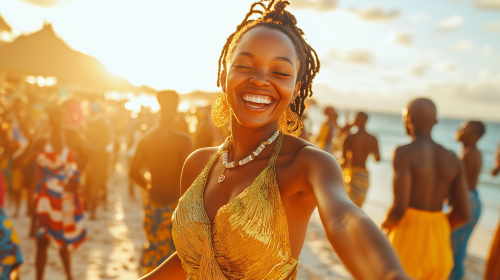 On a sunlit beach in Zanzibar, an African music festival pulses with energy, celebrating Afro culture and the diaspora. A young woman dances with pure joy, gold dress. Her face lit up with emotion, surrounded by a crowd immersed in the vibrant beats. The warm sun casts a golden glow over the scene, blending with the blue of the ocean and sky, creating an inviting, tropical atmosphere. Colorful attire and the rhythm of the waves add to the ambiance. Captured in hyper-realistic 4K, every detail from her movements to the sparkling sea radiates warmth, celebration, and togetherness --ar 16:9 --v 6.1