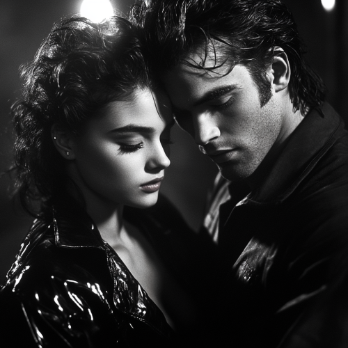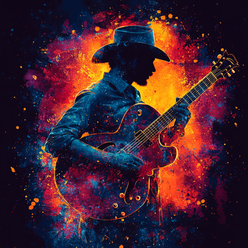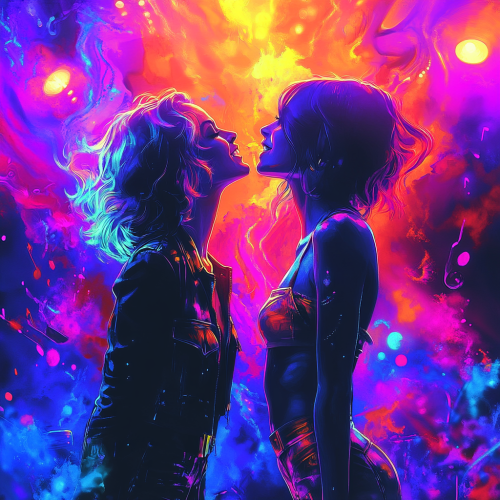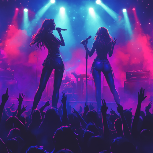 stylized illustration of two women on stage under bright spotlights, one with a vintage rock star aesthetic (leather jacket, tousled hair) and the other with a modern pop style (colorful outfit, short hair). The background is filled with abstract swirling music notes, bright concert lights, and bold neon colors, capturing the intensity of a live performance. The art should have elements inspired by album covers from the 70s and 80s mixed with a modern digital art flair. Incorporate hints of electric blue, deep purple, and sunset orange to give it a dramatic and electrifying look. The style should be reminiscent of a mix between modern pop art and classic rock poster aesthetics, by an artist like Stanley Mouse or Alan Aldridge. Focus on capturing the emotion and connection between the two characters, accentuated by the music-themed visuals in the background, with details in the women's expressions and posture to reflect a sense of longing and intensity. --s 250