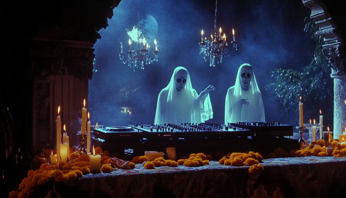 dvd screengrab, from 1982 dark fantasy film, A DJ set in a mystical scene where ghostly, peaceful spirit figures watch over a DJ mixing music. The DJ booth is adorned with candles and offerings like pan de muerto and incense. Spirits are stylized with soft, glowing outlines and gentle smiles, blending into the background of a starry night with marigold-covered altars. The colors should be ethereal, with a focus on blues, golds, and whites, --ar 7:4