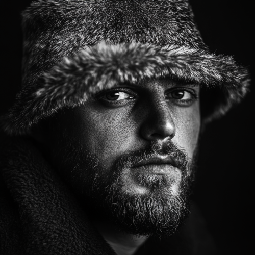 Portrait, Front on view, male, skin pours, beard stubble, wearing a modern fur bucket hat, you can see the face, Jamiroquai style, on a black background, Sony A7III avec GM 50 mm 1.2 - Image #2 --v 6.1