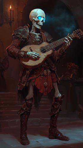 A skeletal bard, playing a lute while standing up, blue glow coming from eyes, wearing brown leather boots and dark burgundy , in the style of digital art. --ar 9:16 --v 6.1