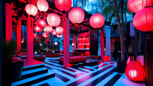 beach club in china with trendy theme, attracting young customers, livehouse, dj bands, lifestyle, music, art, f&b, red and black and white theme colours, west meets east culture, --ar 16:9