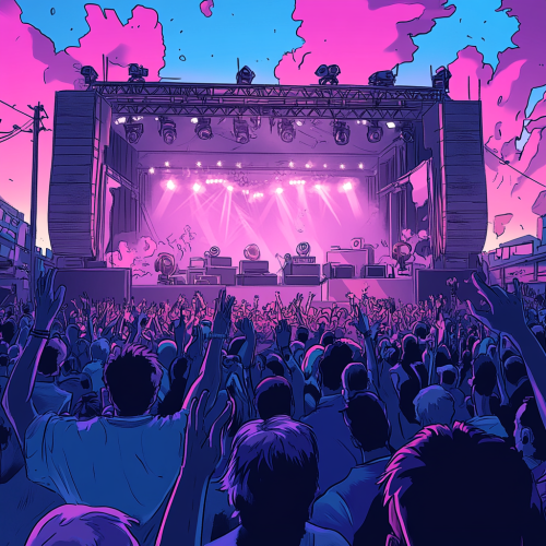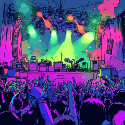 A colorful comic-style illustration of a music concert scene with an empty stage, complete with lighting, speakers, and musical instruments set up. The crowd is in the foreground, full of energy, with hands raised and people cheering. The background includes concert details like spotlights and equipment, emphasizing the anticipation of the crowd. Keep the style vibrant , capturing the lively atmosphere without any performers on stage close up