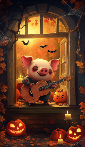 a Halloween zombie pig playing a guitar in a hounted house full of cobwebs and bats, in detailed cartoon style. The scene also features some floating candles and pumpkins around the character. --ar 37:64