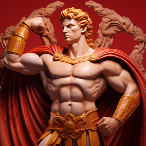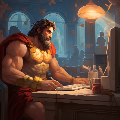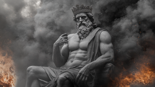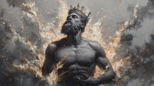 The ancient Greek philosopher had a strong body, determination and confidence in his face and posture, he wore a crown, dressed like a king, surrounded by small flames. The picture contains his full body, grey-themed, grey tones --ar 16:9