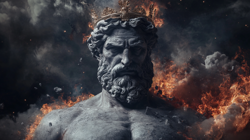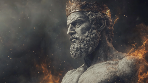 the ancient greek philosopher had a strong body, determination and confidence in his face and posture, he wore a crown, dressed like a king, surrounded by small flames. The picture is his entire upper body, grey-themed, grey tones, --ar 16:9