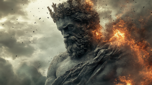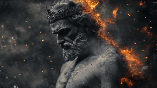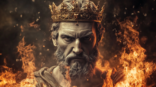 the ancient greek philosopher had a strong body, had the demeanor of a king, he wore a crown, dressed like a king, surrounded by small fires. The picture contains his whole body, grey-themed, grey tones, --ar 16:9