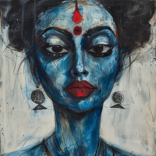Acrylic on canvas painting of Goddess Kali in triptych style. Three distinct panels showing Kali's different moods: calm, ferocious, and smiling. Left panel: Calm Kali in deep blue, serene expression, minimal jewelry. Center panel: Ferocious Kali in black, multiple arms, protruding tongue, wearing a garland of skulls. Right panel: Smiling Kali in vibrant red, benevolent expression, holding a lotus. Each panel should have visible brush strokes and canvas texture. Background should be darker shades of the main color in each panel with subtle sacred geometry patterns. Consistent artistic style across all panels, reminiscent of neo-tantric art. Sharp focus on Kali's face in each panel. Studio lighting to highlight the acrylic paint's texture. 8K resolution, ultra-detailed. --ar 16:9 --stylize 1000 --v 6.0