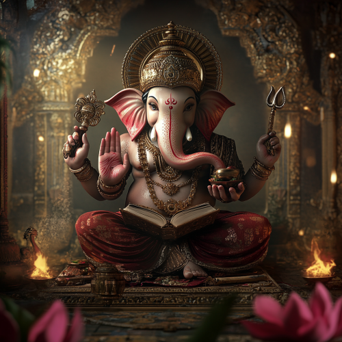 Hindu god Ganesha sitting and god have 4 hands , in two hands he holds lotus and third right hand is Bless position and fourth Left hand he holds a open book, one elephant teeth , sitting in padamasan, backdrop is Golden with lotus atmosphere, devotional and realistic images** hyper realistic cinematic look** create for YouTube video